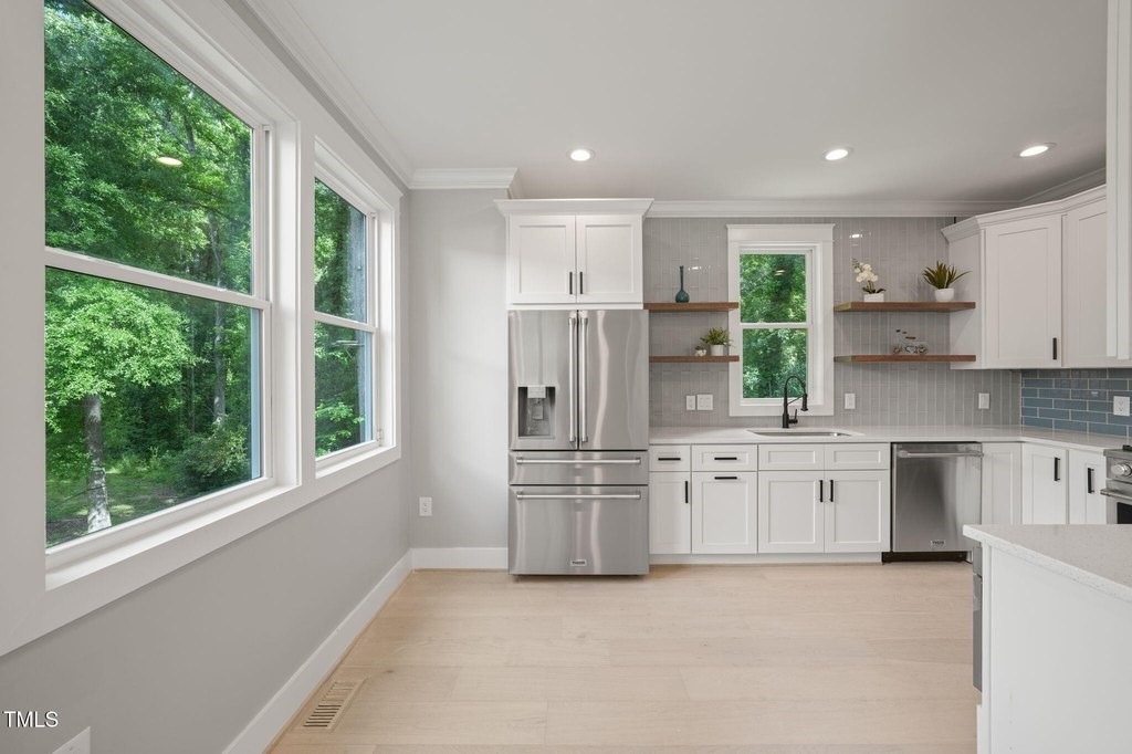 Constructed by S & A Construction, this property boasts an eye-catching all-white exterior offset by striking black shutters, a black front door, and corresponding black gutters. The expansive floor plan, flooded with natural light thanks to ample window placements, creates a sense of openness and warmth. The state-of-the-art kitchen is accentuated by stunning cabinets, shimmering quartz countertops, a tile backsplash, and a six-burner THOR gas stove, alongside top-class Stainless-Steel appliances. The house features a combined living room/dining room area for flexible living arrangements. The main floor houses an impressive primary suite with a luxurious bathroom and a walk-in closet. A conveniently placed half bath is also available on the main level. The second floor unveils a central loft, adorned with polished hardwood floors, three additional bedrooms, and a full bathroom. The property also includes a separate laundry room fitted with attractive tiled flooring. A covered front porch provides a cozy outdoor space for leisure. The house incorporates a sizeable walk-in crawl space and a front circular driveway for ease of access. The exterior is skillfully crafted using durable Fiber Cement board and is trimmed with Miratec non-rot material, promising longevity. Stroll across the bridge to the extend back yard. This space is waiting for your personal touch. See Feature Sheet in Documents.